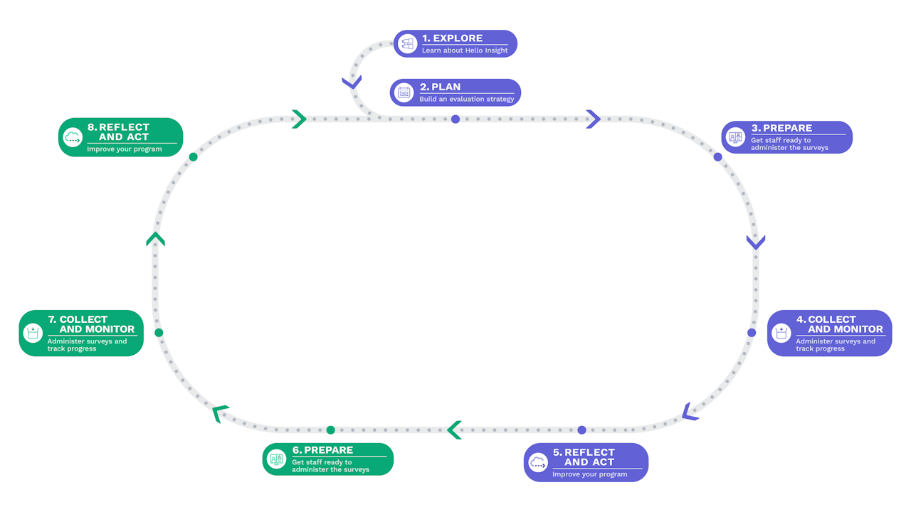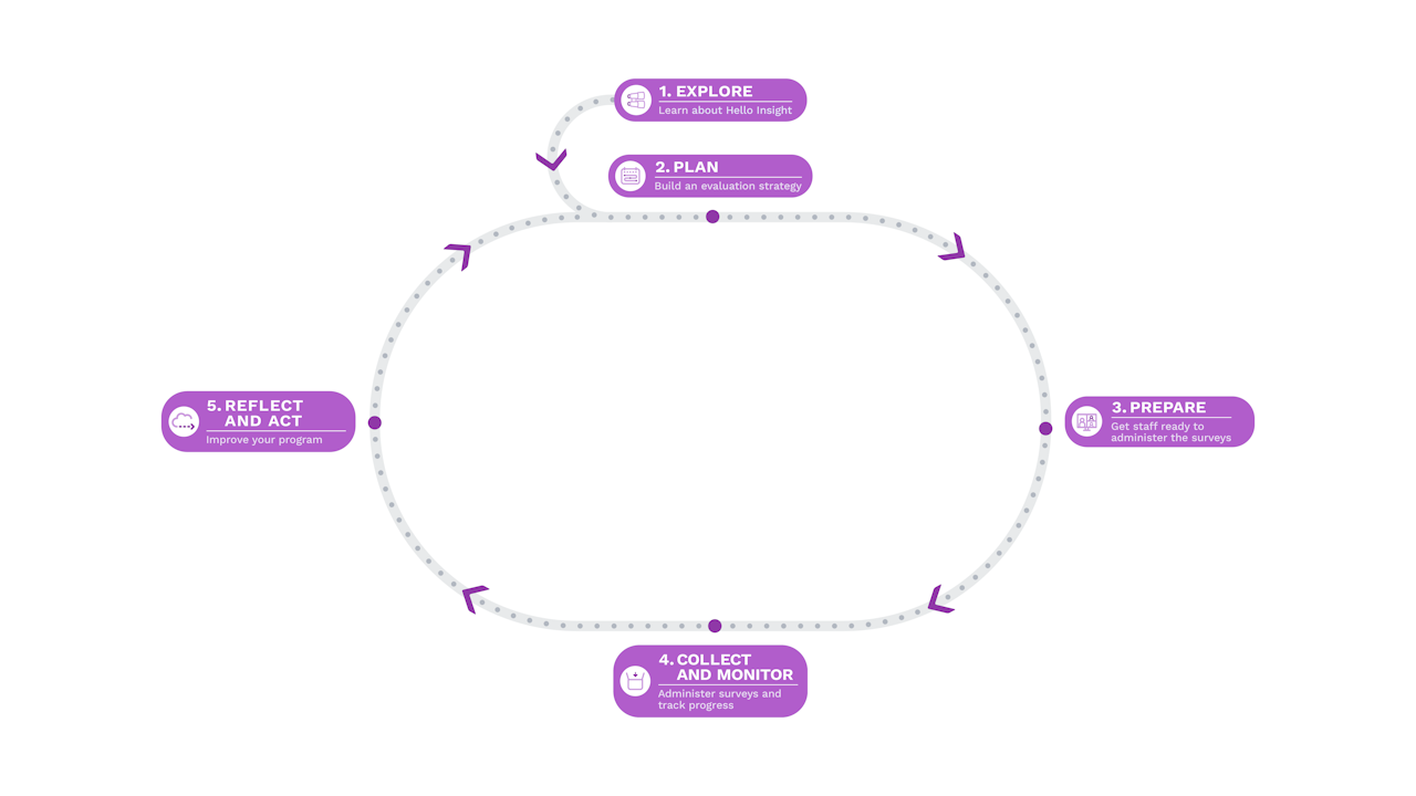 The Hello Insight Learning Journey serves as a roadmap, guiding members through the steps for evaluating their programs. It helps them stay oriented, easily track their progress, and access key information at each stage.